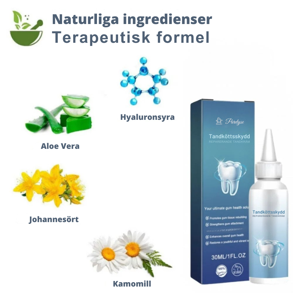 - Hyaluronsyra – hjälper att fylla ut och öka elasticiteten i tandköttet.
