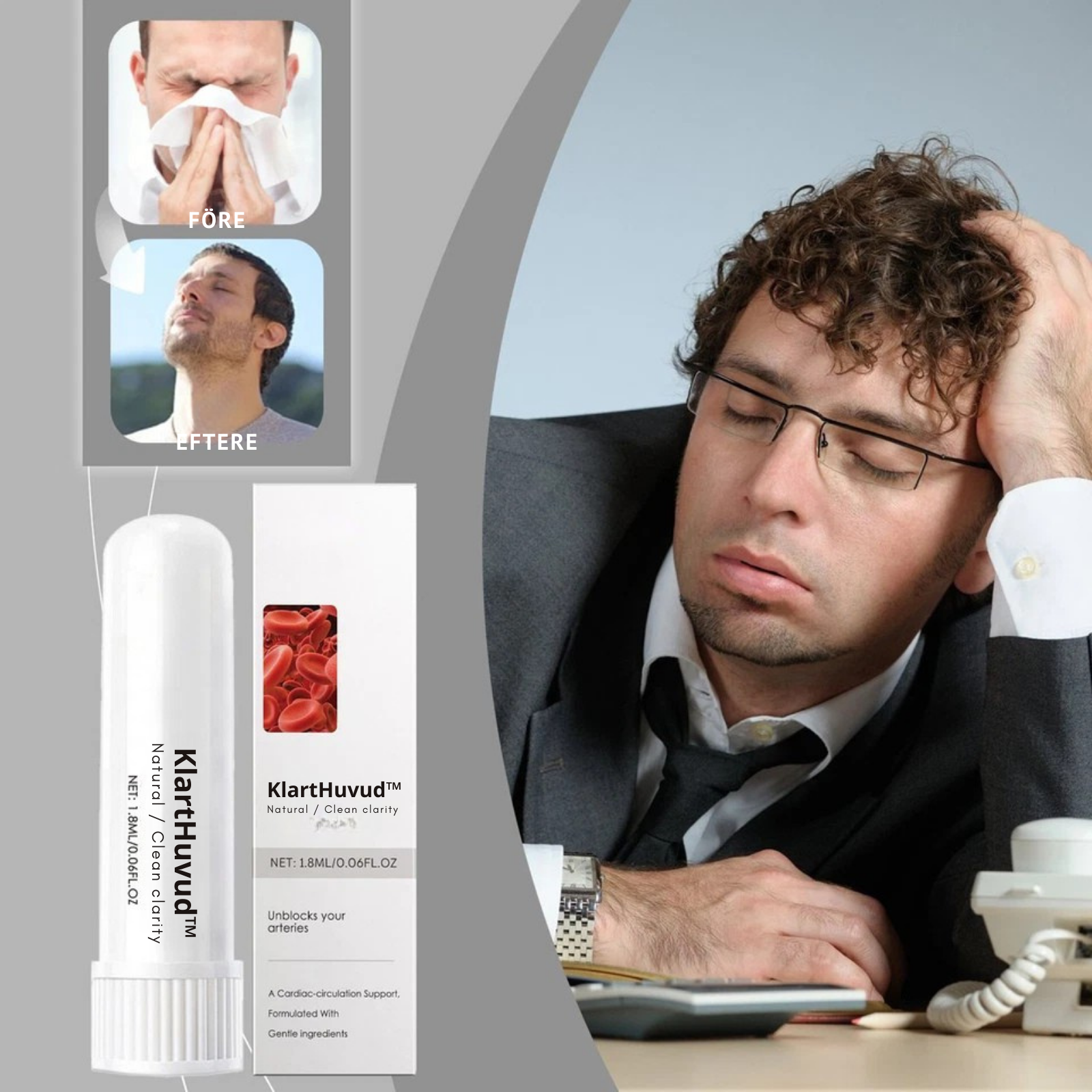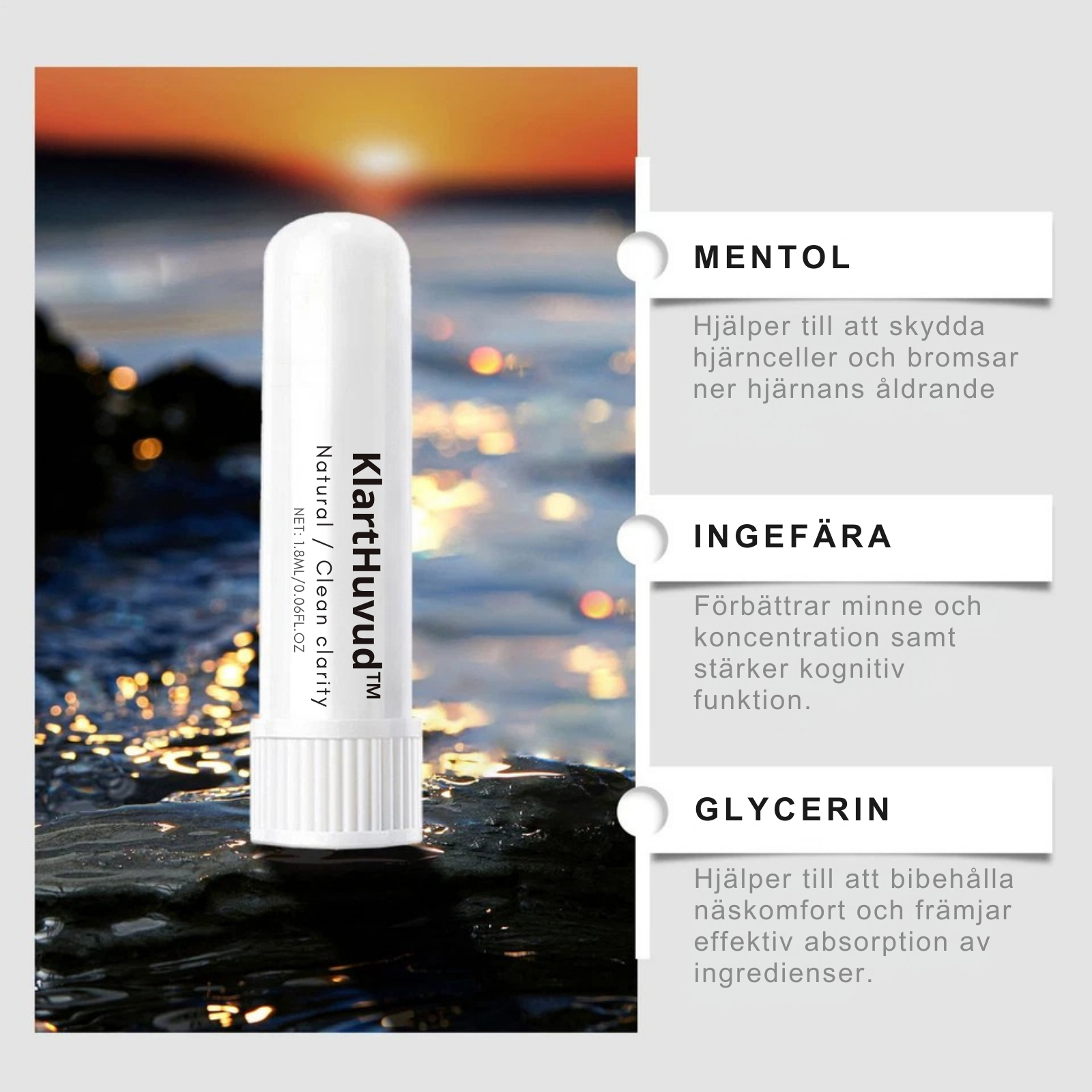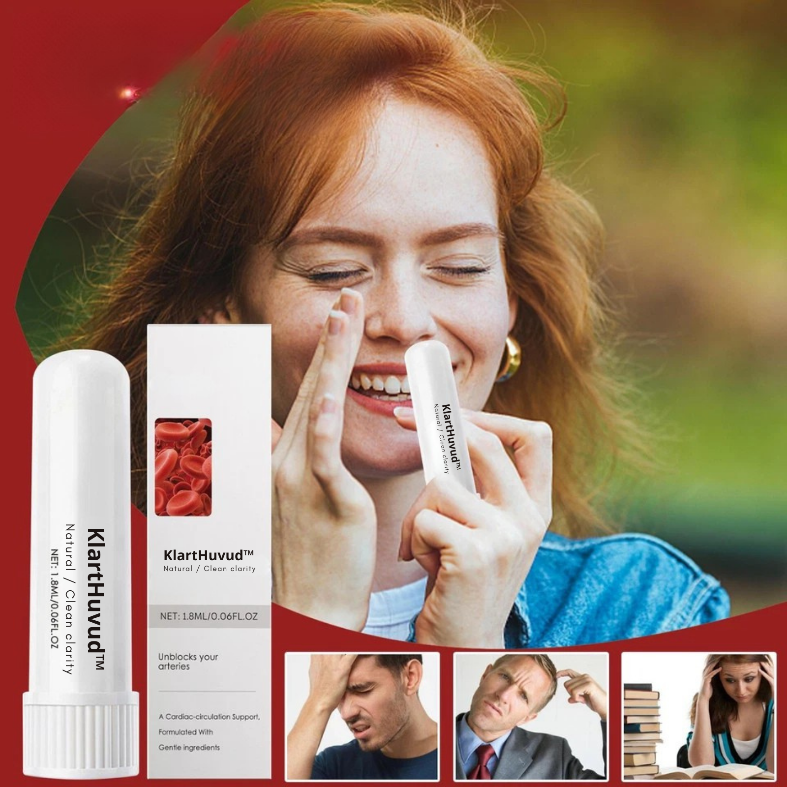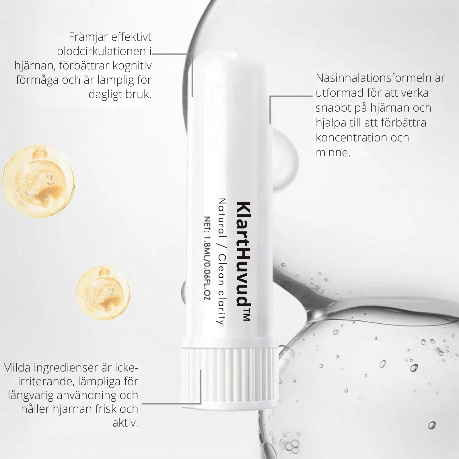 Klarthuvud är en inhaler-produkt utvecklad för att komma åt problem som glömska, koncentrationssvårigheter och “hjärndimma”. Bara några drag med inhalatorn om dagen aktiverar hjärnfunktioner, stimulerar blodcirkulationen och förbättrar kognitiv klarhet – med upp till 94 % förbättring inom två veckor.