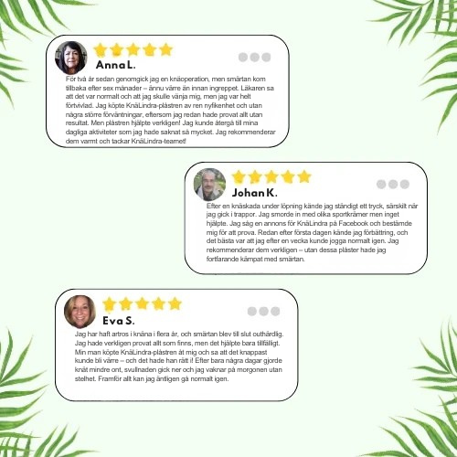 KnäLindra-plåster angriper alla tre orsakerna samtidigt – de förbättrar cirkulationen genom att leverera syre djupt ner i leden, minskar inflammation med örter (malört, gurkmeja, ingefära) och stöder regenerering genom att signalera till din kropp att reparera sig själv.