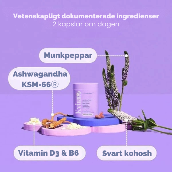 hur Kvinno hjälper – Silverljus och extrakt av munkpeppar bidrar till att främja en hälsosam hormonbalans, medan KSM-66® Ashwagandha stöder kroppens stresshantering. Tillsammans hjälper dessa ingredienser till att balansera humörsvängningar under klimakteriet.