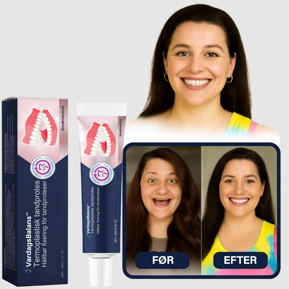 VardagsBalans är inte ett lim. Det är ett termoplastiskt mellanlager som anpassar sig perfekt till ditt tandkött när det värms upp och blir hårt när det kyls ner – som en specialtillverkad fyllning till din protes.