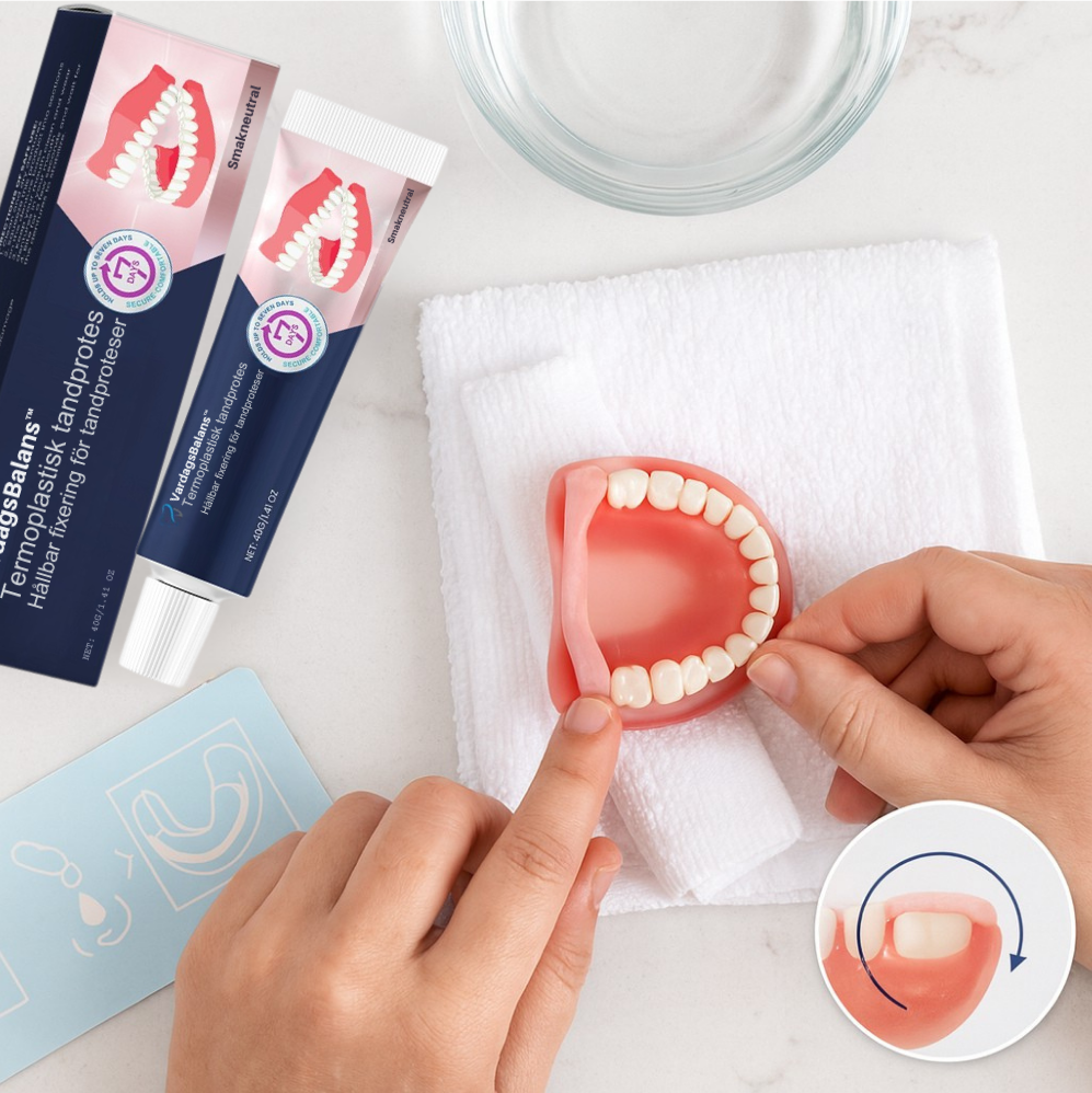 Termoplastmaterialet fyller de luckor som skapas av naturlig käkbensresorption. Det fungerar som en tillfällig mjuk underfyllning – helt utan tandläkarbesök och till en bråkdel av kostnaden.